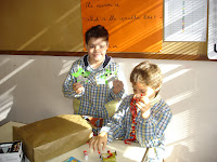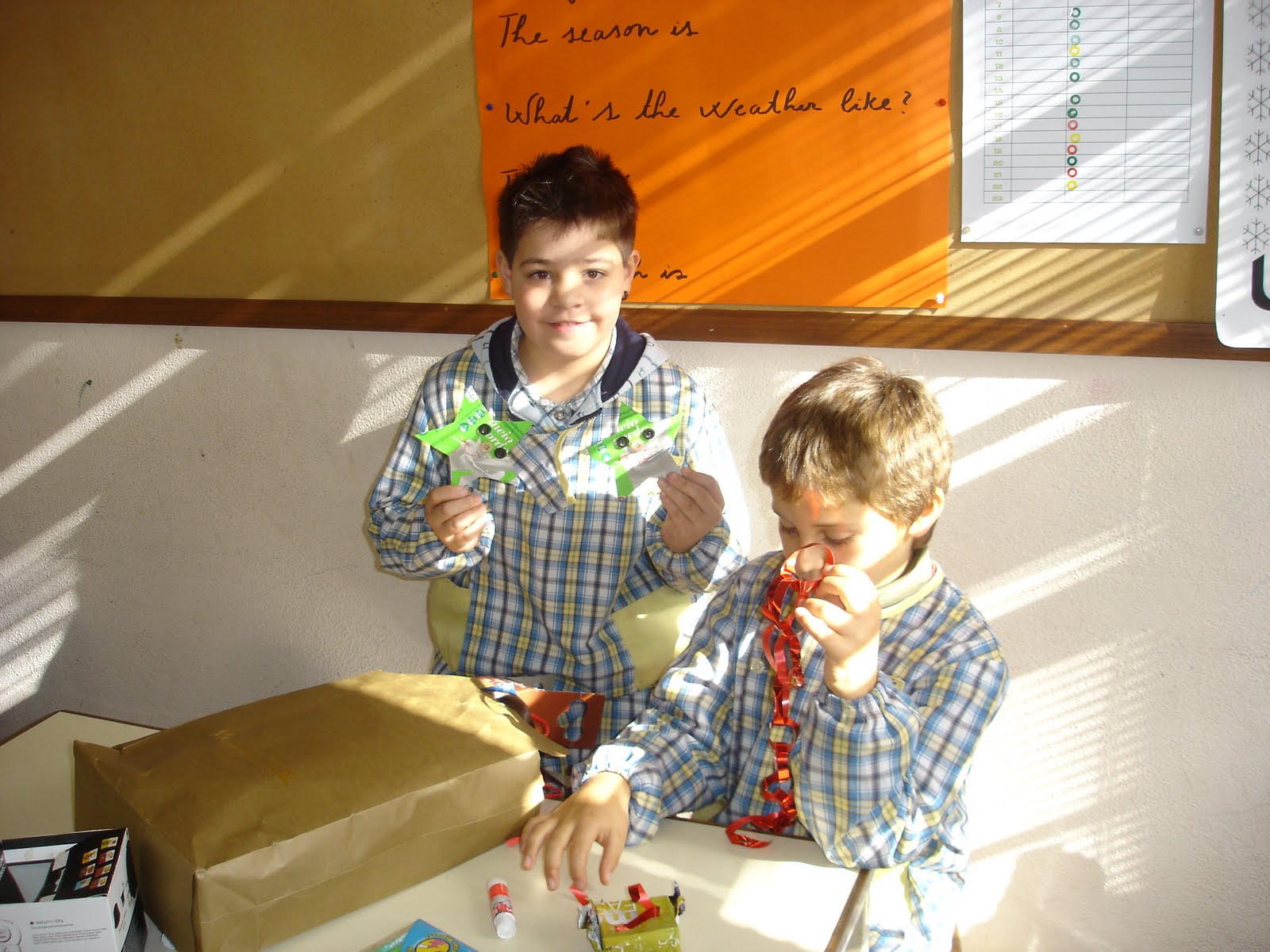 Os meninos construiram enfeites e postais de Natal através da reutilização de garrafas de plástico, papel, cartão, rolhas, entre outros resíduos.